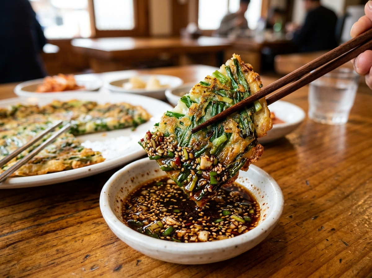 Q: 부추전은 어떤 소스와 잘 어울리나요?